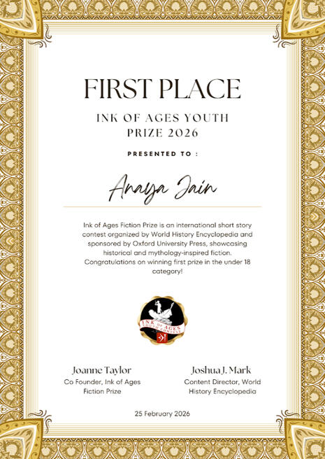 1st place in the World History Encyclopedia x Oxford University Press "Ink of Ages" Short Story Contest- a prestigious international short story competition- winning out of ~700 global entries. Recognized for original fiction writing competing against international submissions. Judged and praised by history professors from top-tier universities.
